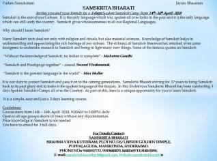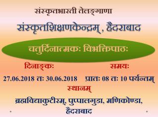 5 days spoken samskrit classes start from 23/04/2018 to 27/04/2018 at 10 am to 5.30 pm. At Brahma Vidya Kuteer -Plot No 189- Gurukulam Line Lane- next to Golden Temple- Secretariat Colony- Puppalaguda - Manikonda. For registration please call 8688169713(Akhilesh) or 9440557722(Sanjeeva)..