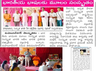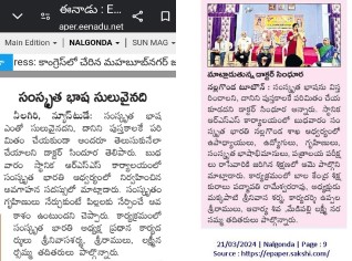 प्रपञ्च-भाषाणां माता संस्कृतभाषा अस्ति - EenaaDu इति दैनिक-पत्रिकायां आगता वार्ता तेलुगु माध्यमे NTR Government Mahila College प्रंशुपालः डा. विजयकुमारः “प्रपञ्च-भाषाणां माता संस्कृतभाषा अस्ति” इति उक्तवान्। “वेदानां सैन्स् (science)” इति विषये आयोजित दिनात्मक कार्यक्रमे अयं महोदयः मुख्यातिथि रूपेण भागं स्वीकृत्य एवमुक्तवान्। संस्कृत भरत्ती तेलङ्गाणा पक्षतः राजमल्लेशः भागं स्वीकृतवान्। / / /..