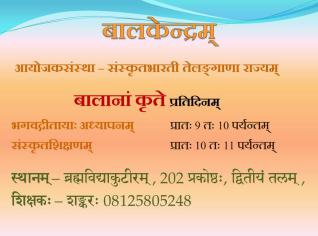 Bhagwat Geeta and Spoken Samskrit Clasees for children every day from 20/4/2018. Timings: 9 am to 11 am. At Brahma Vidya Kuteer -Plot No 189- Gurukulam Line Lane- next to Golden Temple- Secretariat Colony- Puppalaguda - Manikonda. For Details please contact : Shanker : 812580524..