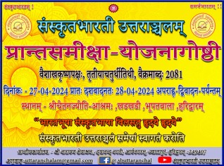 संस्कृतभारत्या कार्यविस्ताराय प्रतिवर्षं प्रत्येकं प्रान्ते समीक्षायोजनागोष्ठी भवति तथैव अस्मिन् वर्षेपि प्रान्तसमीक्षायोजनागोष्ठी अप्रेल मासस्य 7-04-2023 दिनांकस्य मध्याह्नात् 8-04-2023 दिनांकस्य सायं पञ्चवादन पर्यन्तं महालक्ष्मी-मन्दिरे बेरीपड़ाव हल्द्वान्यां भविष्यति। यस्मिन् गत वर्षस्य समीक्षा तथा आगामी वर्षस्य कार्ययोजना भविष्यति | जयतु संस्कृतम् | वन्दे संस्कृतमातरम् | भारतभूषा संस्कृतभाषा विलसतु हृदये हृदये ... .. . . ...