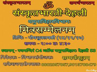 संस्कृतभारती-देहलीप्रान्तस्य यमुनाविहारविभागेन दिसम्बरमासस्य २४ दिनाङ्के मध्याह्ने २:०० वादनतः च ०४:३० वादनयावत् मित्रसम्मेलनम् आयोजिष्यते ।