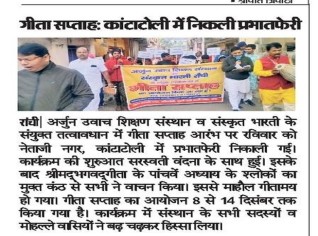 अर्जुन उवाच शिक्षण संस्थान, संस्कृतभारत्यौ संयुक्त तत्त्वावधाने गीता-सप्ताहस्य आरम्भावसरे रविवासरे प्रात:षड्वादने नेताजीनगरे, काँटाटोल्यां ,बंगाली मुहल्लायां प्रभातफेरी अभवत् | कार्यक्रमस्य आरम्भ:सरस्वती वन्दनया अभवत् | सर्वे बाला: महिलाश्च मिलित्वा गीताया: पञ्चम् अध्यायस्य श्लोकवचनं मुक्तकण्ठेन कृतवन्त: | सम्पूर्ण नेताजी नगरस्य वातावरणं गीतामयम् अभवत् |